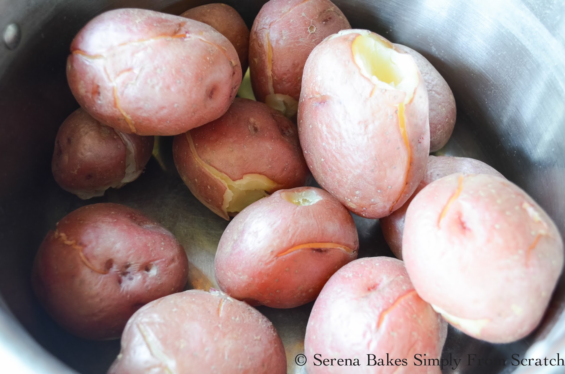 - In a large pot add red potatoes and fill pot with cold water. Bring water to a boil and cook 30-45 minutes or until potatoes are tender when poked with a fork. Drain potatoes and allow to cool. Do not cover pot while cooling so moisture can escape.
