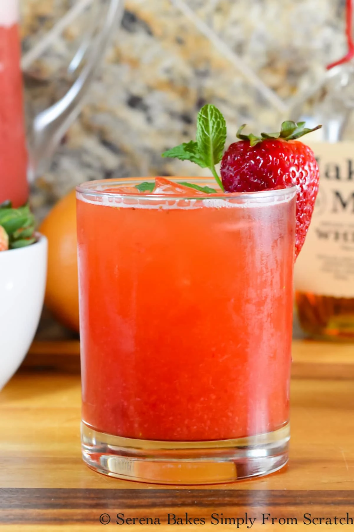 I usually add the whiskey as I'm serving the cocktails to have a nonalcoholic option available so everyone can enjoy the Strawberry Iced Tea.